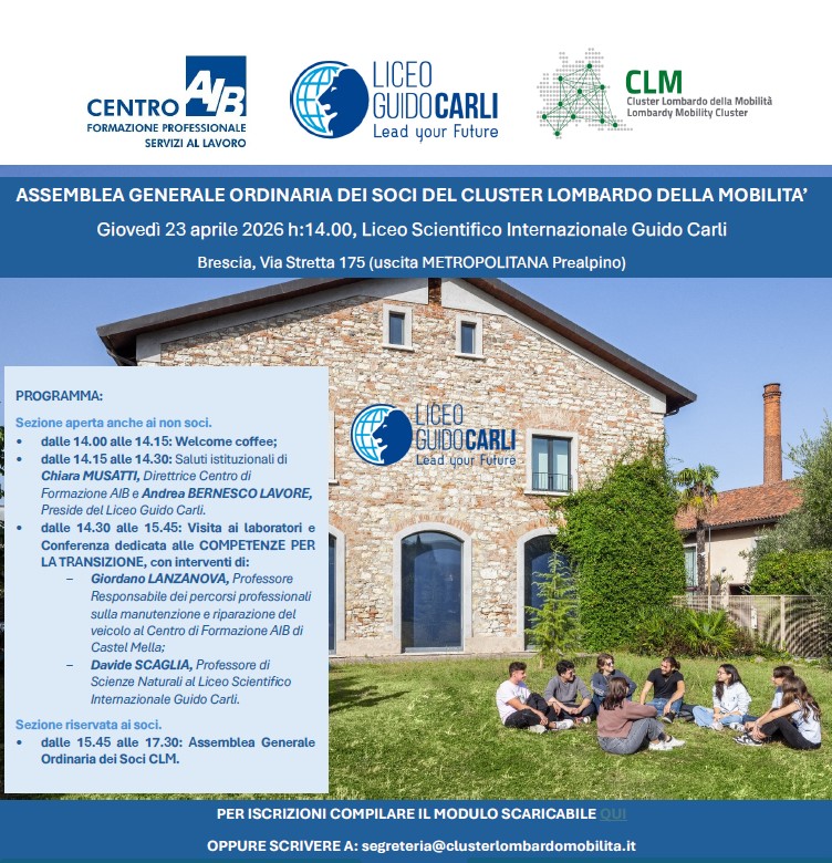 11 aprile 2025 h:16.00 - Assemblea Generale Ordinaria del Cluster Lombardo della Mobilità in presenza presso AQM – Servizi Tecnici alle Imprese, Via Edison 18 – 25050 Provaglio D’Iseo (BS).