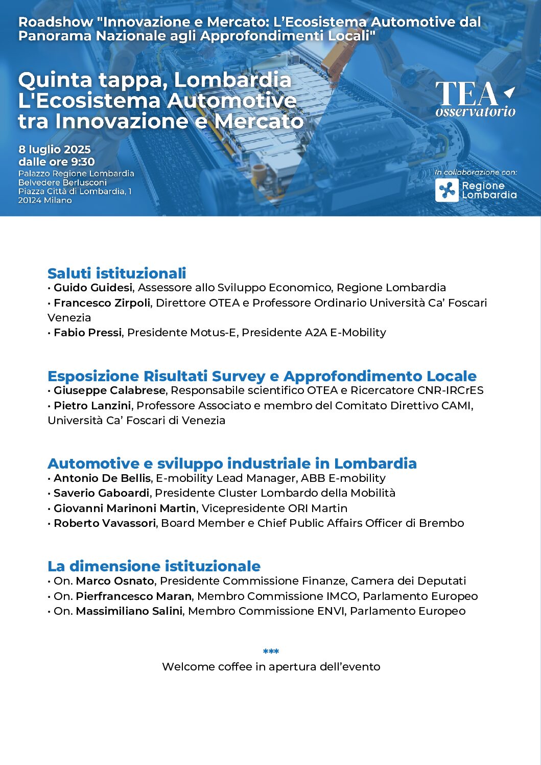 Quinta tappa del road show “Innovazione e Mercato: L’Ecosistema Automotive dal Panorama Nazionale agli Approfondimenti Locali”, promosso dall’Osservatorio sulle Trasformazioni dell’Ecosistema Automotive Italiano (www.osservatoriotea.it), che si terrà martedì 8 luglio a Palazzo Regione Lombardia.